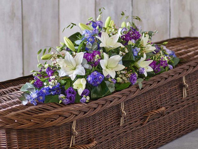 A beautiful array of blue, purple and white blooms including delphiniums, lilies and stocks.