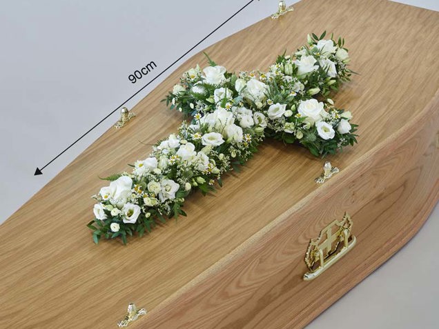 An elegant cross with white blooms, including roses, chrysanthemums and limonium, with beautiful foliage.